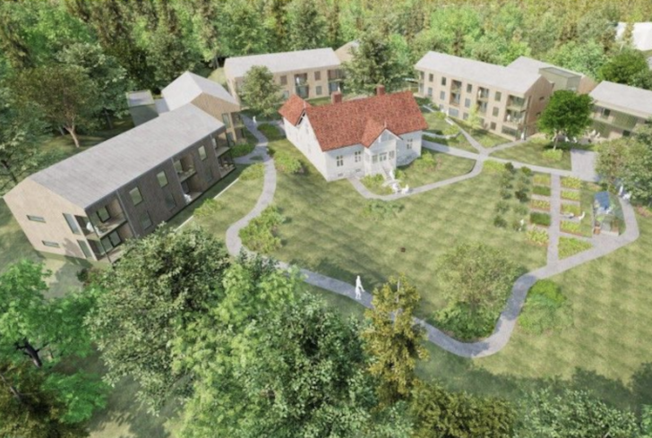 Illustrasjon som viser hvordan omsorgsboligene på Bjorbekk kan komme til å se ut med villaen som har vært Øyestad prestebolig i forgrunnen.