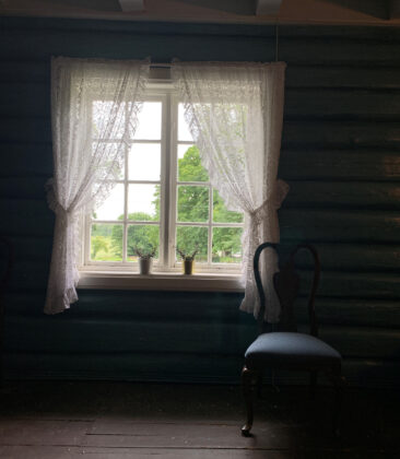 - Våningshuset er et stort to-etasjes laftet tømmerbygg med høyt valmtak.