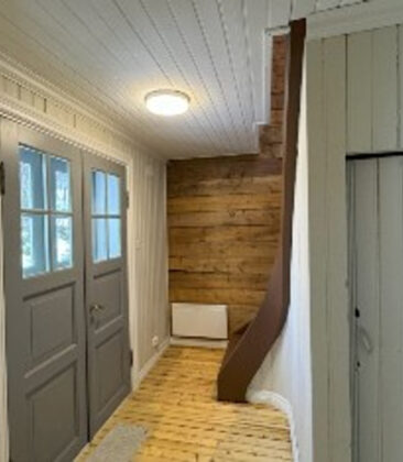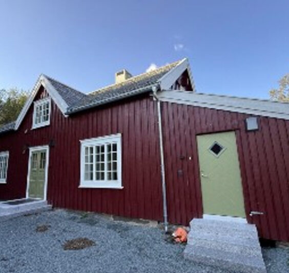 Den gamle borgstua med skifertak ble rehabilitert med moderne kjøkken, wc, og vaskerom i 2024.